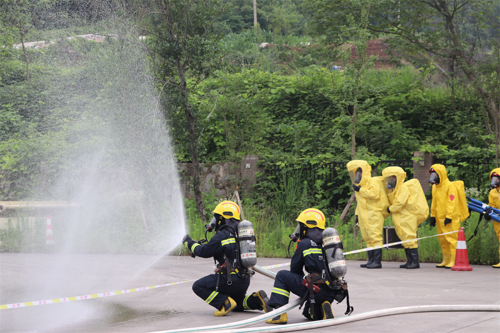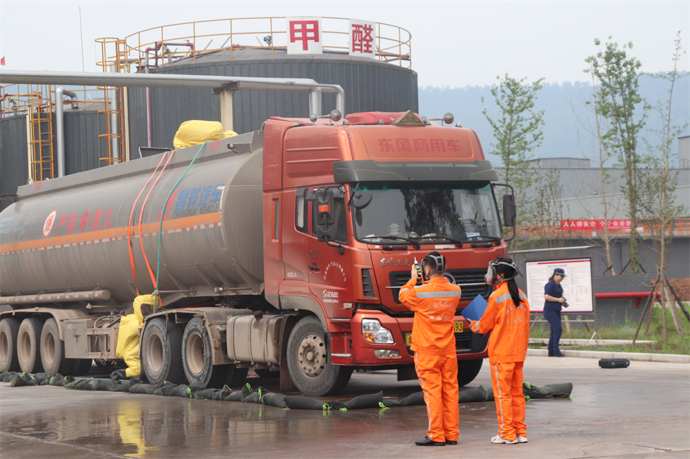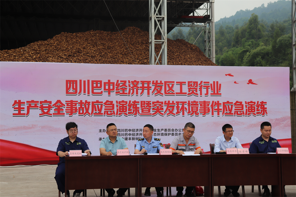 本次演练以巴中建丰公司甲醛罐车在卸车时发生泄漏,1名工作人员出现中毒现象,木料堆码区因雷电引发自燃为背景,相继启动巴中建丰公司火灾、甲醛泄漏事故应急预案,经开区工贸行业生产安全事故应急预案二级响应,现场立即实施救援处置。